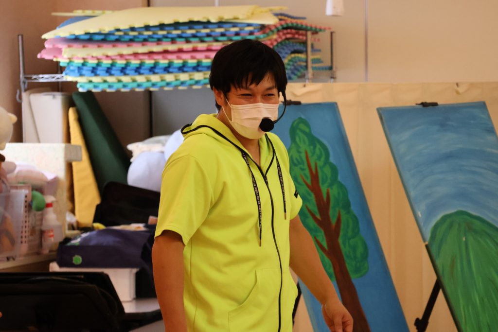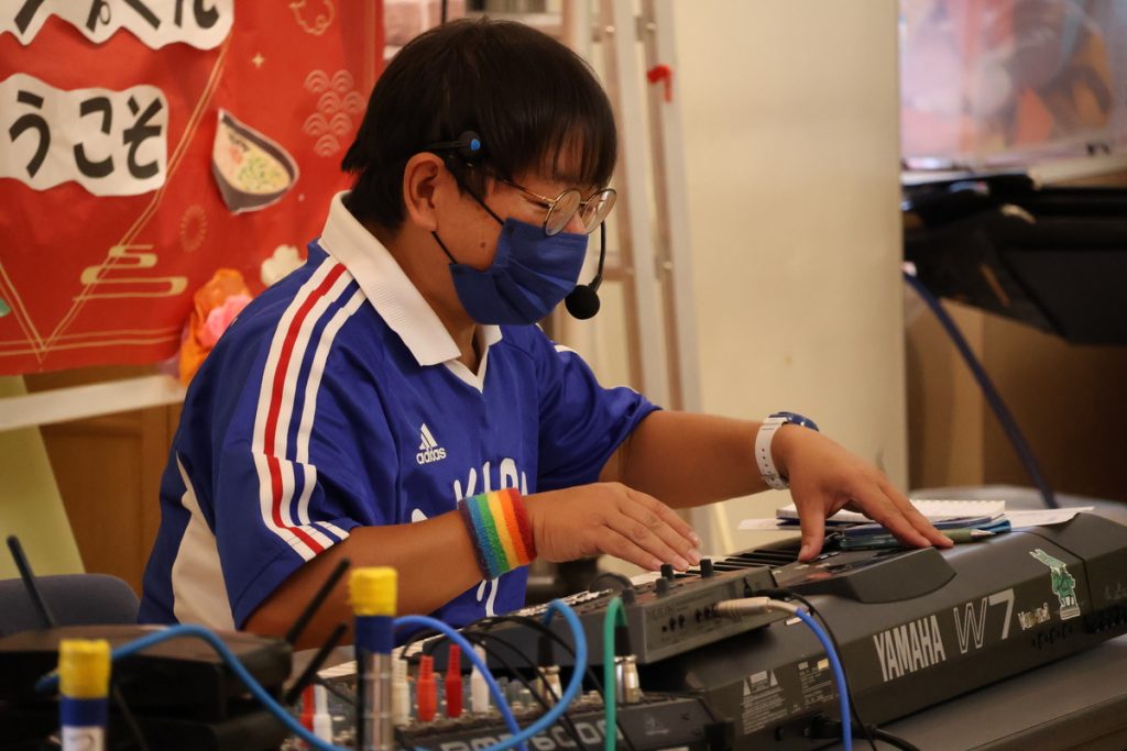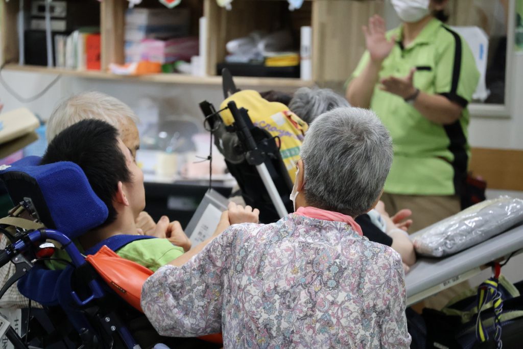 この日の会場を明るく包み込んだのが、あそびうたユニット「あきらちゃん&ジャンプくん」によるパフォーマンスでした。軽快なリズムの音楽が流れ出すと、会場の空気が一変。カラフルな衣装と楽しい歌声が空間いっぱいに広がり、職員やご家族から自然と手拍子が起こりました。