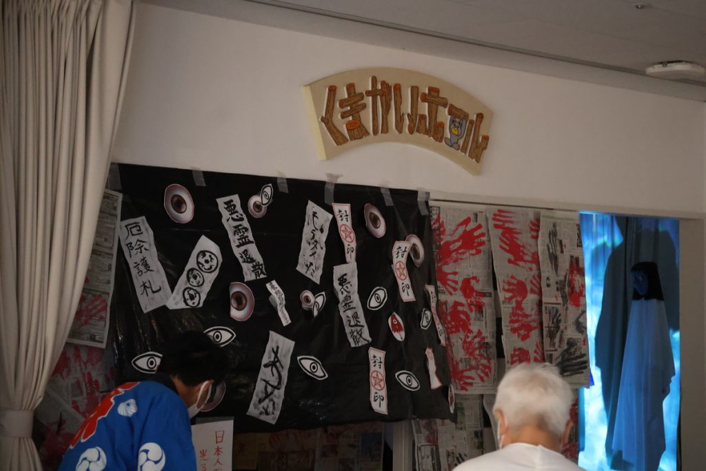 ひときわ注目を集めていたのが、職員が工夫を凝らして手づくりした「おばけやしき」です。暗くしたホールや音響の工夫など、施設ならではの安全面に配慮しながらも“非日常”の空気を演出した空間は、多くの入所者さん・利用者さんが訪れる人気のコーナーとなりました。